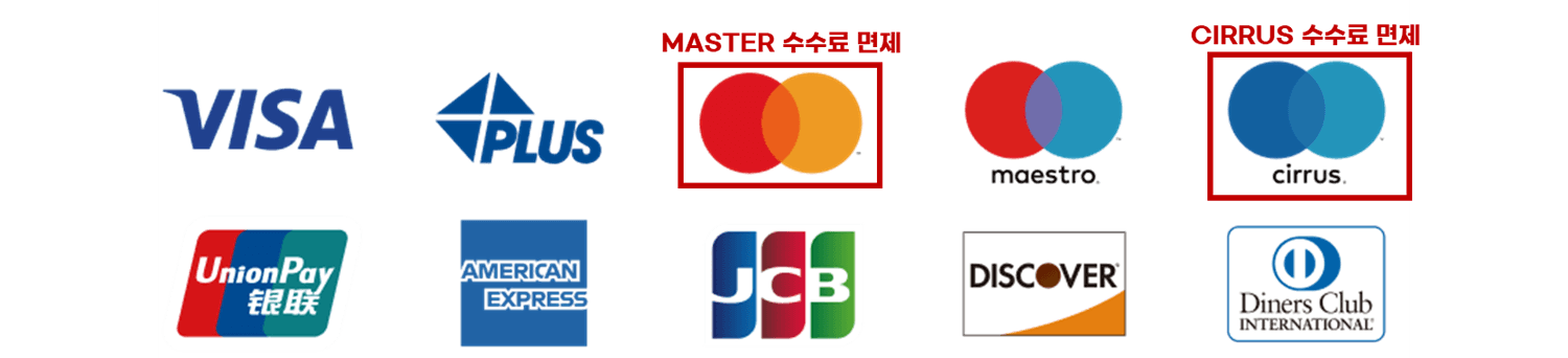 중요한 점은 ATM 기기의 경우 특정 브랜드에서만 수수료가 면제되기 때문에, MASTER 그리고 CIRRUS라고 표기되어 있는 ATM 기기를 찾아서 인출을 하시기 바랍니다. 해외결제 또한 전월 실적과는 무관하게 수수료 면제 혜택을 받을 수 있고 한도는 없습니다. 면제 서비스는 맞지만, 국제브랜드사 정책에 따라 변경될 수 있고, 국제 브랜드사 정책 변경으로 수수료 1% 초과될 경우 1%까지만 지원이 되는 점 참고 바랍니다.