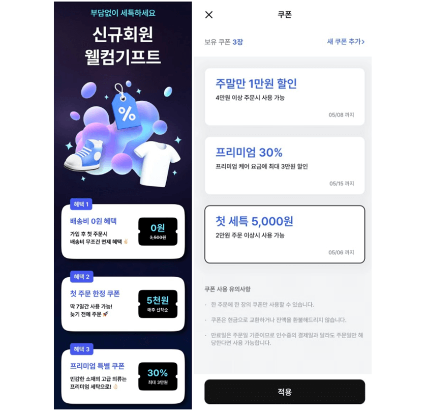 신규회원 가입을 진행하시고 다양한 쿠폰을 수령하셔서 우선 활용하시면 좋을 것 같습니다.