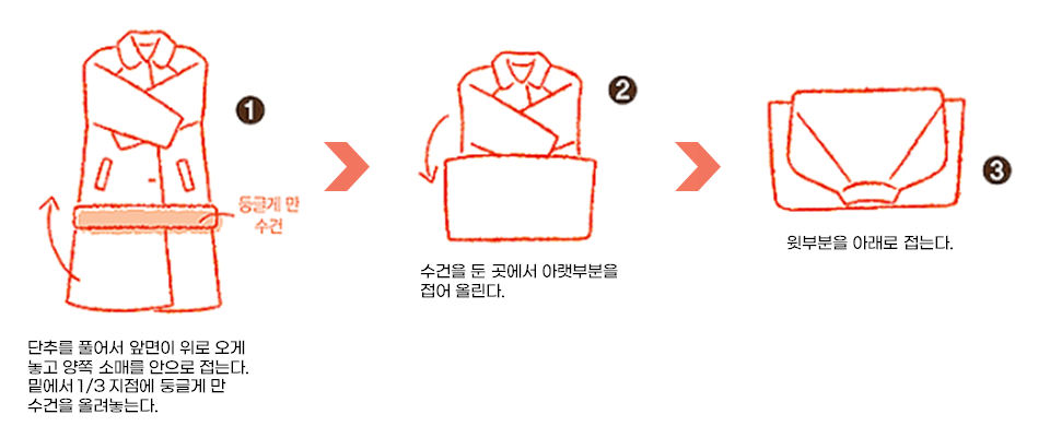 아래와 같은 방식으로 접으면 수납하기 좋고 옷에도 손상이 가지 않습니다.