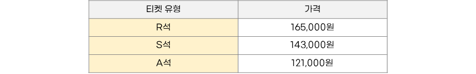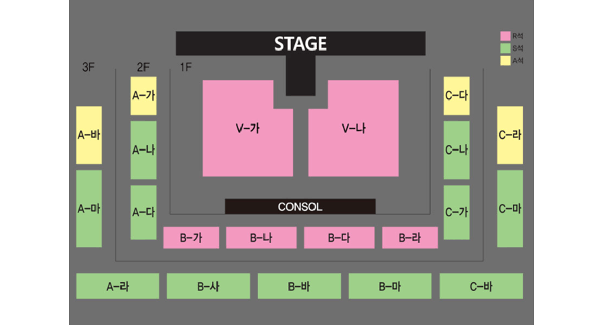 R석, S석 그리고 A석으로 나뉘어 있으며, 가격이 다르니, 참고하셔서 예매하시면 되겠습니다.