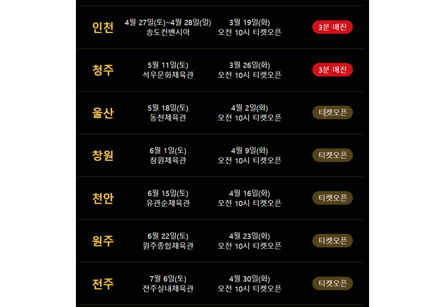 현재는 인천과 청주 콘서트 예매가 매진되었습니다.