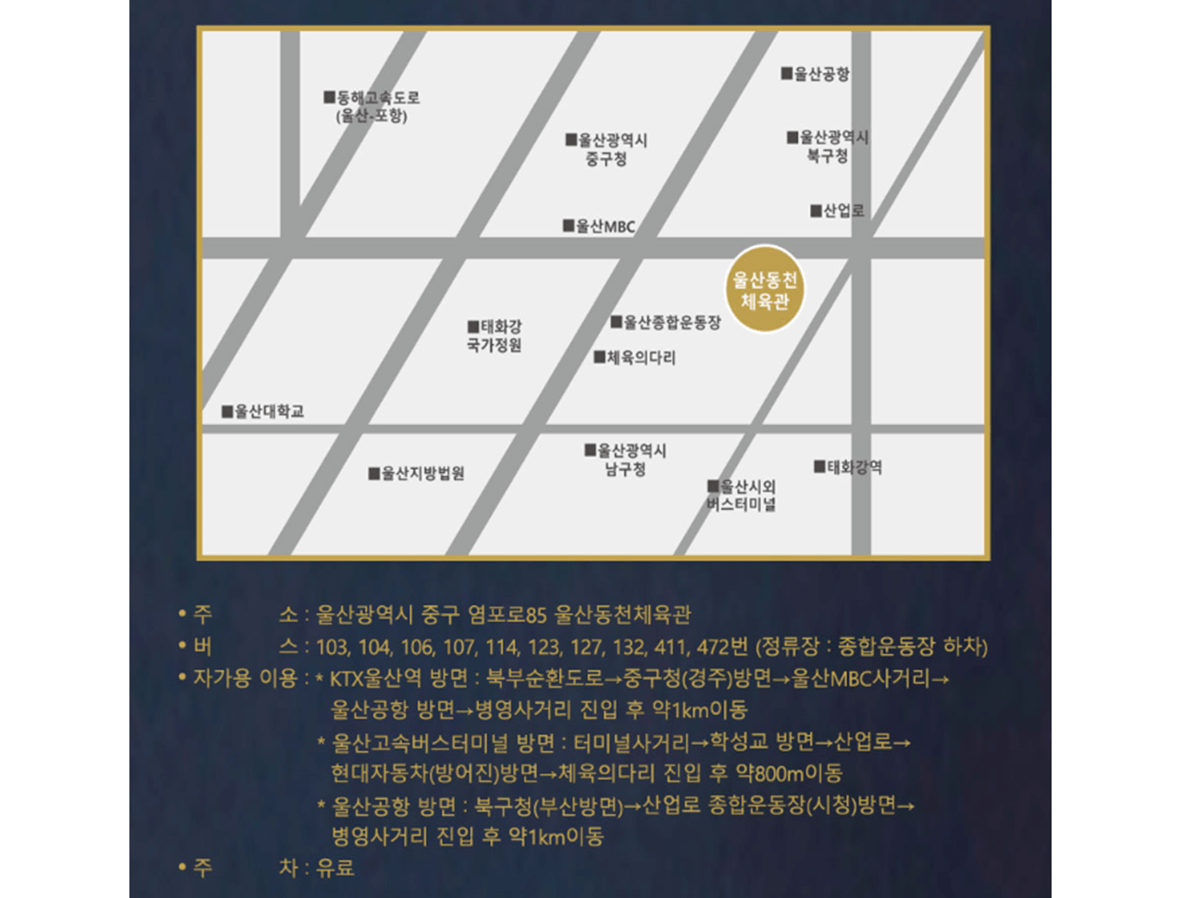 울산광역시 중구 염포로 85 울산동천체육관에서 열리게 됩니다.