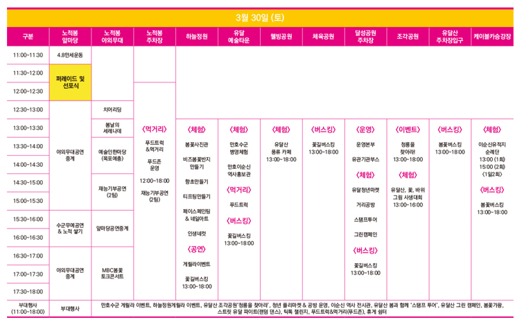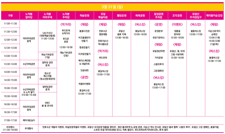 마지막날은 3월 31일(일) 또한 노적봉 앞마당과 야외무대에서는 다양한 공연들이 준비되어 있습니다.