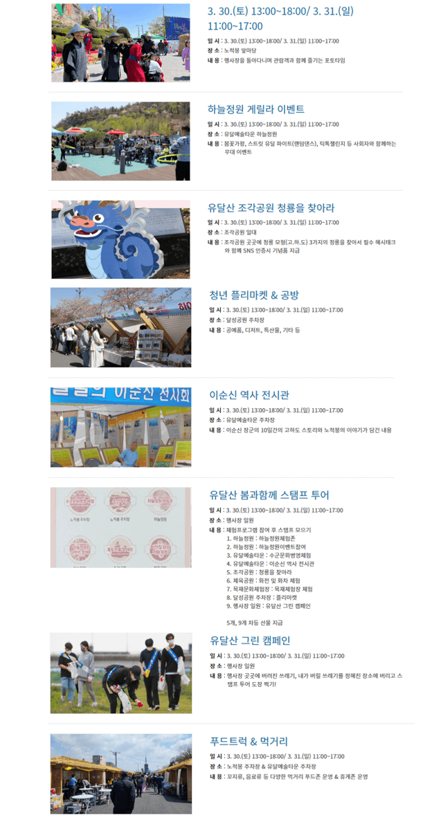 올해는 “이순신의 선택, 노적봉!”이라는 주제로 봄꽃이 만개하는 유달산에서 개최를 할 계획이라고 합니다.