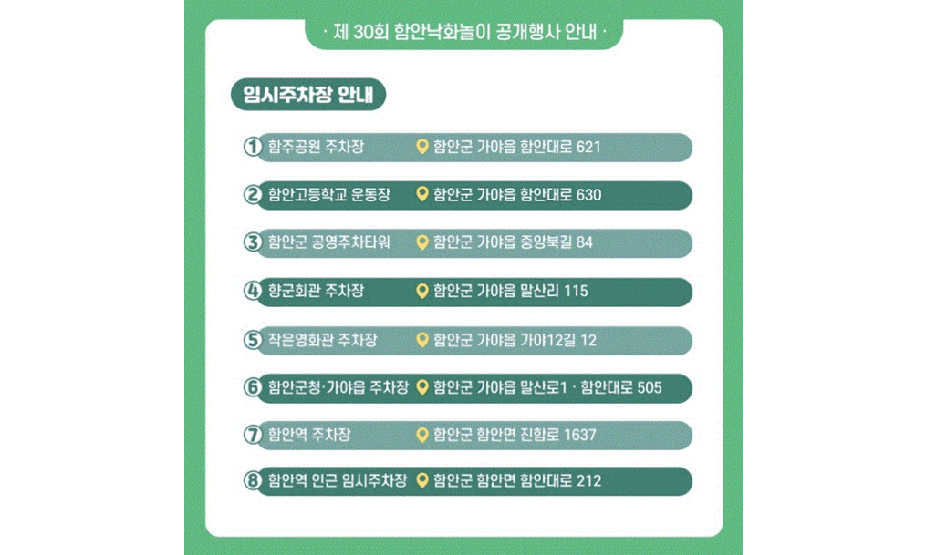 작년 행사를 찾아간 경험상, 함안군에서 8개의 임시주차장을 운영을 한 바 있습니다.